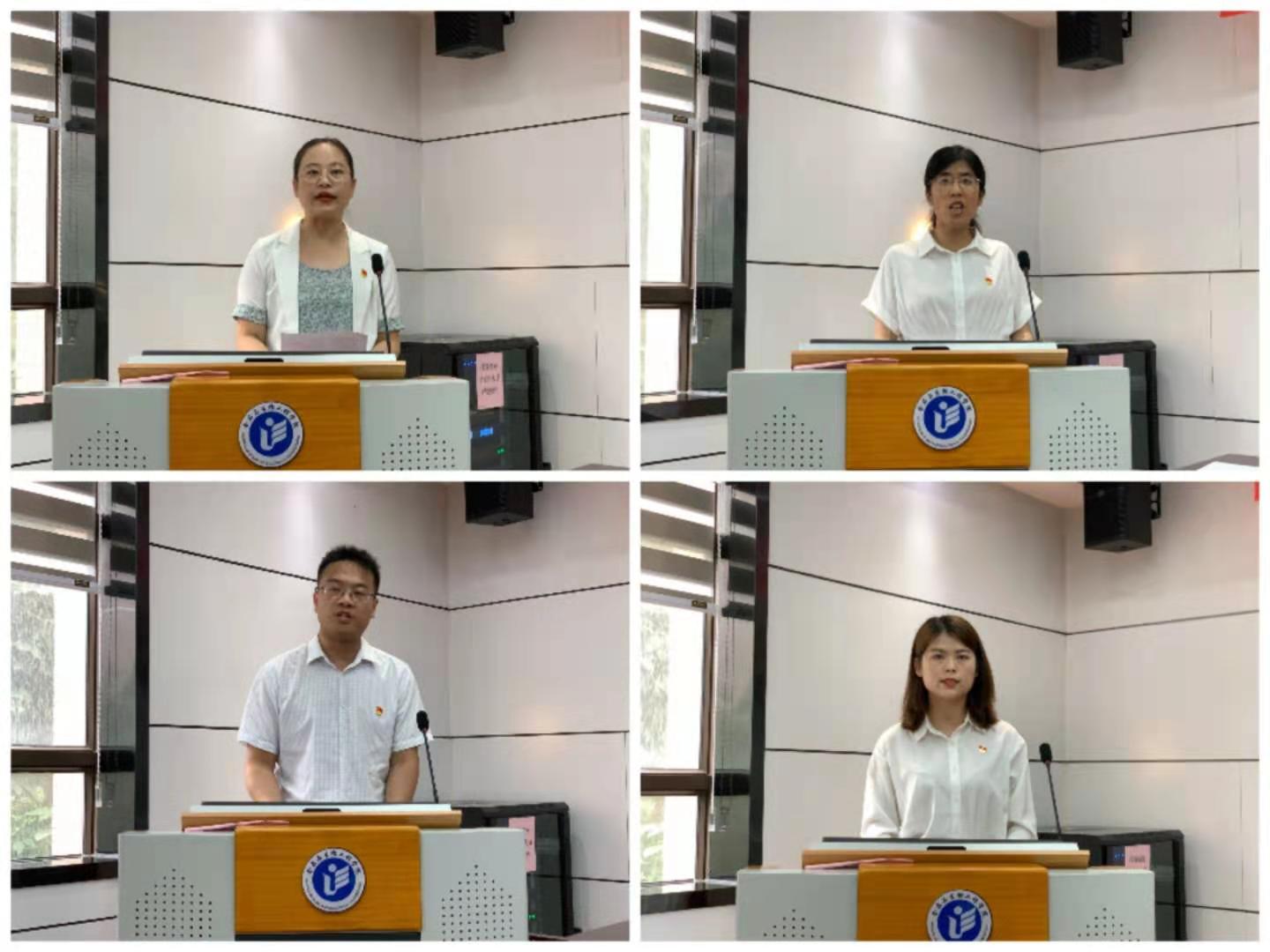 优秀共产党员代表孔阳、刘欢、徐秦峰、刘戈妹四位师生进行发言。发言中,他们表达了对党组织培养的感激之情,老师们结合以往工作经历,表示会落实高校立德树人根本任务,立足育人工作、专业特色,积极进取,勇于担当,争取为学校、学院的事业发展做出贡献,员工代表刘戈妹从入党历程、下乡支教、员工工作几个方面回顾大学经历,表示一定会牢记老师的教诲,继续努力,争做优秀的共产党员。