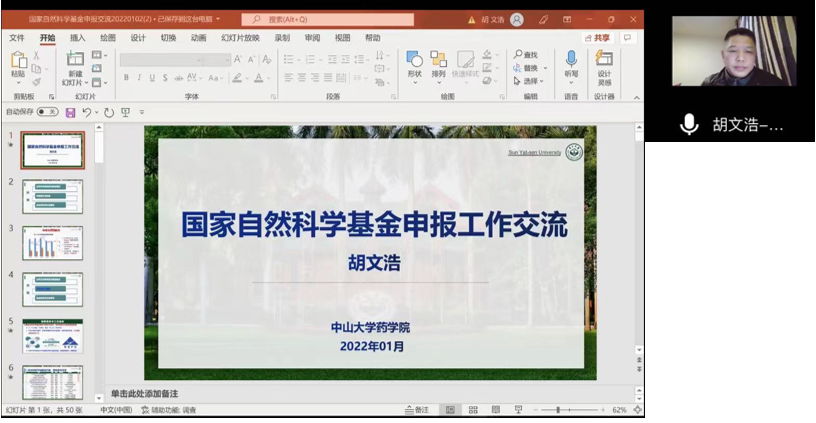 1月24日下午,应williamhill及科技处、前沿院邀请,中山大学药学院经理、国家杰出青年基金获得者、教育部“长江学者”特聘教授胡文浩教授云做客公司“前沿科学报告”,并作了题为“国家自然科学基金申报工作交流”线上精彩学术报告,报告由williamhill副经理李国梁主持,学院全体基金申报教师参加了本次报告。