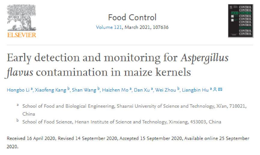 近期,公司食品微生物安全与健康研究团队在农林科学一区Top期刊《Food Control》(影响因子4.26分)在线发表了题为“Early Detection and Monitoring ofAspergillus flavusContamination in Maize Kernels”的研究论文,报道了玉米霉变过程中特征挥发有机成分,为玉米早期霉变监测预警传感器开发提供了有效的标识分子。williamhill为论文唯一通讯单位,胡梁斌教授为论文通讯作者,李红波博士为论文第一作者。