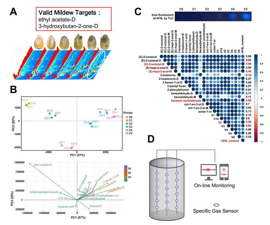 玉米作为中国重要的粮食作物之一,在加工贮藏等环节极易受到黄曲霉菌的侵染而失去使用价值。挖掘黄曲霉菌污染发生早期预警标识分子具有重要意义。本文采用顶空-气相色谱-离子迁移谱法(HS-GC-IMS)对玉米籽粒中黄曲霉侵染各阶段的挥发性有机化合物(VOCs)变化进行了研究,共鉴定出55种VOCs,且样品无需前处理。根据特征峰图片库结果结合化学计量学方法可以对玉米的早期霉变程度进行有效的区分。使用热图聚类分析和主成分分析发现乙酸乙酯-D和3-羟基-2-丁酮-D可作为玉米籽粒早期霉变的潜在生物标志物。此外,黄曲霉毒素B1含量与(E)-2-辛烯醛、苯乙醛、(E)-2-庚烯醛、2-庚酮-D和2-正戊基呋喃等的生成量呈正相关。这些结果为霉变监测预警传感器开发提供了有效的标识分子,文章提出了基于这些标识分子的粮库玉米霉变在线监测预警系统开发构想,为仓储农产品霉变预警监测系统的开发提供了重要的理论基础。据悉,以本文内容为基础申报的相关发明专利也进入了实际审查过程。