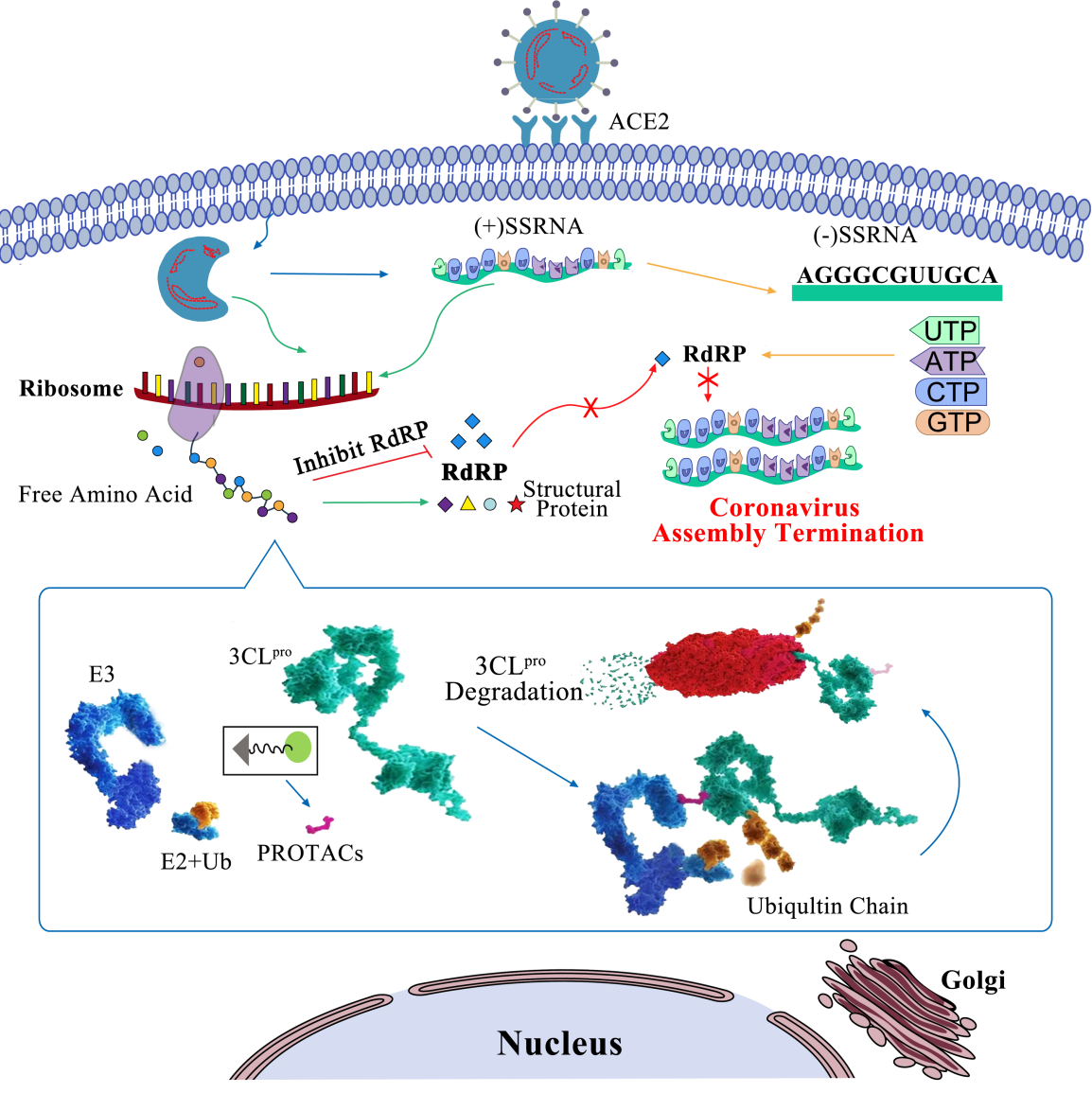 《An update review of emerging small-molecule therapeutic options for COVID-19》、《The development of Coronavirus 3C-Like protease (3CLpro) inhibitors from 2010 to 2020》与《RNA-dependent RNA polymerase (RdRp) inhibitors: The current landscape and repurposing for the COVID-19 pandemic》3篇综述系统地介绍了和COVID-19治疗相关的多种小分子药物治疗策略[2],包括RNA依赖性RNA聚合酶(RdRp)[3]和3C样蛋白酶(3CLpro)[4]等重要的病毒作用靶点及其小分子抑制剂,并对其作用机制及构效关系进行深入探讨。作者团队还提出并阐释了3CLpro可逆共价PROTACs的研发思路,将小分子抑制剂的“占位驱动”与PROTACs的“事件驱动”有机结合,在低剂量下形成多轮次对3CLpro的抑制与降解,清除被侵袭细胞内3CLpro的堆积,较为彻底地阻断3CLpro的生物功能和对下游通路蛋白的加工,抑制冠状病毒在细胞内的组装与复制。