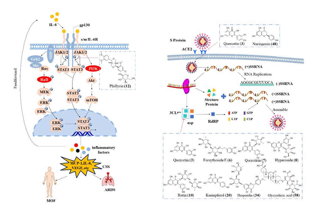 《Medicinal Chemistry Insights into Forsythia Honeysuckle (Lianhuaqingwen) Capsules:A Chinese Herbal Medicine Repurposed for COVID-19 Pandemic》以药物化学视角从方解、制备工艺、质量标准和生物活成分及其作用机制对连花清瘟胶囊进行了全面的综述[1]。通过文献研究,连翘苷抑制JAK/STAT通路对IL-6等多种炎症因子调节进而控制炎症因子风暴以实现在新冠肺炎治疗中的抗炎作用。而连花清瘟胶囊的抗病毒机制则可能依靠槲皮素、柚皮素竞争性的结合ACE2从而阻断病毒S蛋白与ACE2结合,进一步阻断冠状病毒进入体内。同时,芦丁等8种活性成分可以抑制冠状病毒3CLpro,有效阻断RNA复制和转录的过程,从而阻断病毒的复制。