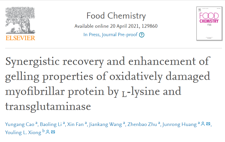 近日,公司天然食品高分子团队在一区Top期刊《Food Chemistry》(影响因子6.306)在线发表了题为“Synergistic recovery and enhancement of gelling properties of oxidatively damaged myofibrillar protein by L-lysine and transglutaminase”的研究论文,报道了外源性碱性氨基酸(赖氨酸)/谷氨酰胺转氨酶(TG)复配修复/改善氧化损伤肌原纤维蛋白(MP)凝胶性能的方法及内在机制,为“低盐、无磷”条件下改善氧化损伤原料肉的加工性能提供了一定的理论依据和参考。中文核心期刊《肉类研究》客户端第一时间对该研究进行了推送报道。