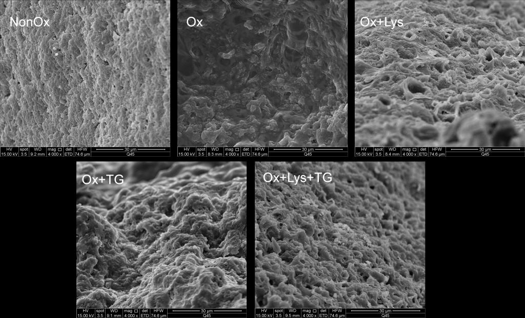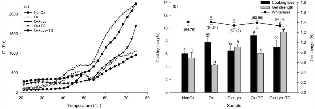 研究结果表明:添加5 mmol/L Lys显著改善了氧化损伤MP凝胶的蒸煮得率(16.8%)和破断强度(增加了65.5%);而TG(E:S=1:500)处理导致氧化损伤MP凝胶的破断强度提高41.8%,蒸煮损失增加13.3%。二者组合(Lys+TG)表现出极大的协同增效作用,所得凝胶具有细腻、光滑和致密的网络结构。因此,通过Lys和TG的组合可以实现氧化损伤MP凝胶特性的显著改善。