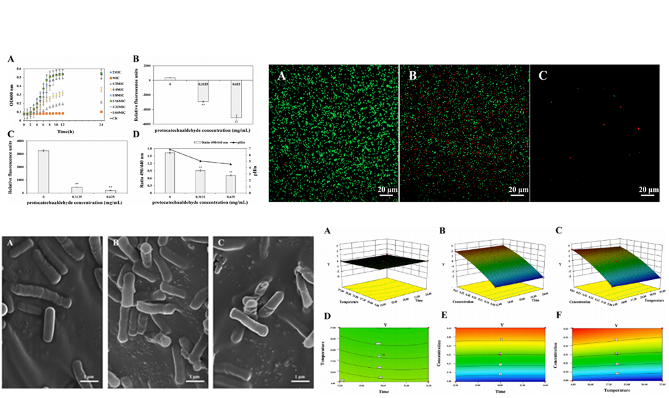 研究结果表明,原儿茶醛通过破坏胞质膜完整性,导致胞内环境紊乱、膜去极化和pHin降低,从而有效抑制小肠结肠炎耶尔森氏菌生长。质子梯度的动态坍塌和ATP池的耗尽可能是通过离子通道紊乱和膜上特定目标的破坏导致膜破坏的主要原因。原儿茶醛还能有效预防猪肉中小肠结肠炎耶尔森氏菌的污染。